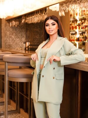 ГлавнаяКаталогЖенская одеждаКостюмыБрючные Классический брючный костюм с пиджаком на пуговицах оливковый