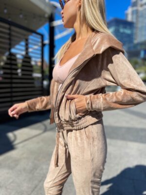 Спортивный костюм велюр с укороченной кофтой светло-бежевый